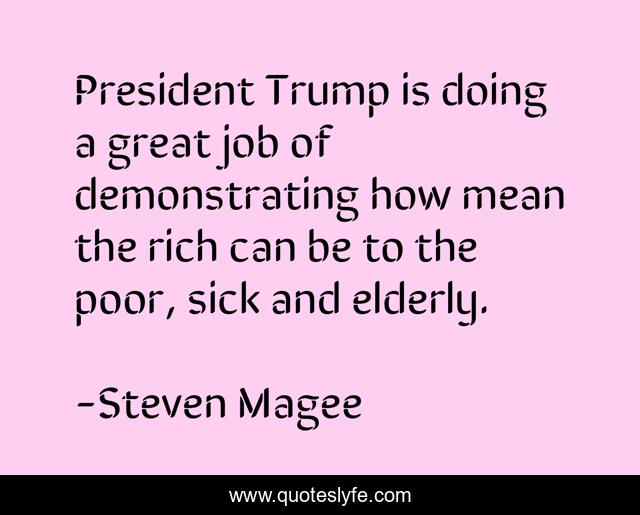 This page presents the quote "President Trump is doing a great job of demonstrating how mean the rich can be to the poor, sick and elderly.". Author of this quote is Steven Magee. This quote is about poor, great, aged, trump, usa, government, demonstrating, ill, republicans,.