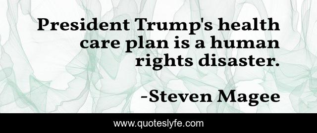 This page presents the quote "President Trump's health care plan is a human rights disaster.". Author of this quote is Steven Magee. This quote is about trump, usa, rights, health, plan, human, president, republican, care,.