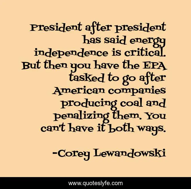 This page presents the quote "President after president has said energy independence is critical. But then you have the EPA tasked to go after American companies producing coal and penalizing them. You can't have it both ways.". Author of this quote is Corey Lewandowski. This quote is about american, energy,.