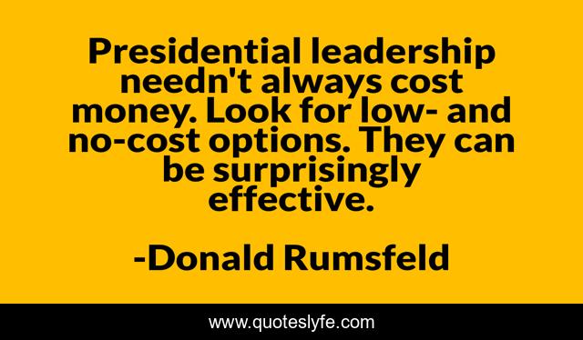 This page presents the quote "Presidential leadership needn't always cost money. Look for low- and no-cost options. They can be surprisingly effective.". Author of this quote is Donald Rumsfeld. This quote is about money, cost, look,.