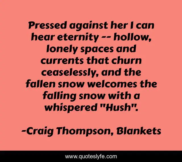 This page presents the quote "Pressed against her I can hear eternity -- hollow, lonely spaces and currents that churn ceaselessly, and the fallen snow welcomes the falling snow with a whispered "Hush".". Author of this quote is Craig Thompson, Blankets. This quote is about beautiful, blankets, novel, love, affection,.