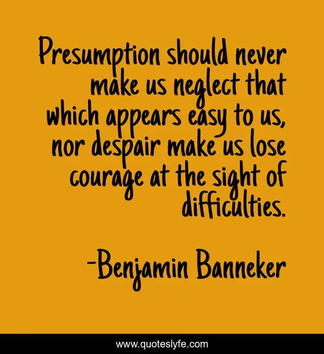 This page presents the quote "Presumption should never make us neglect that which appears easy to us, nor despair make us lose courage at the sight of difficulties.". Author of this quote is Benjamin Banneker. This quote is about despair, sight, easy,.