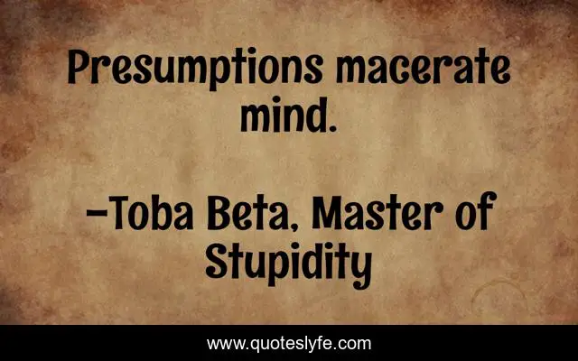 This page presents the quote "Presumptions macerate mind.". Author of this quote is Toba Beta, Master of Stupidity. This quote is about sure, fact,.