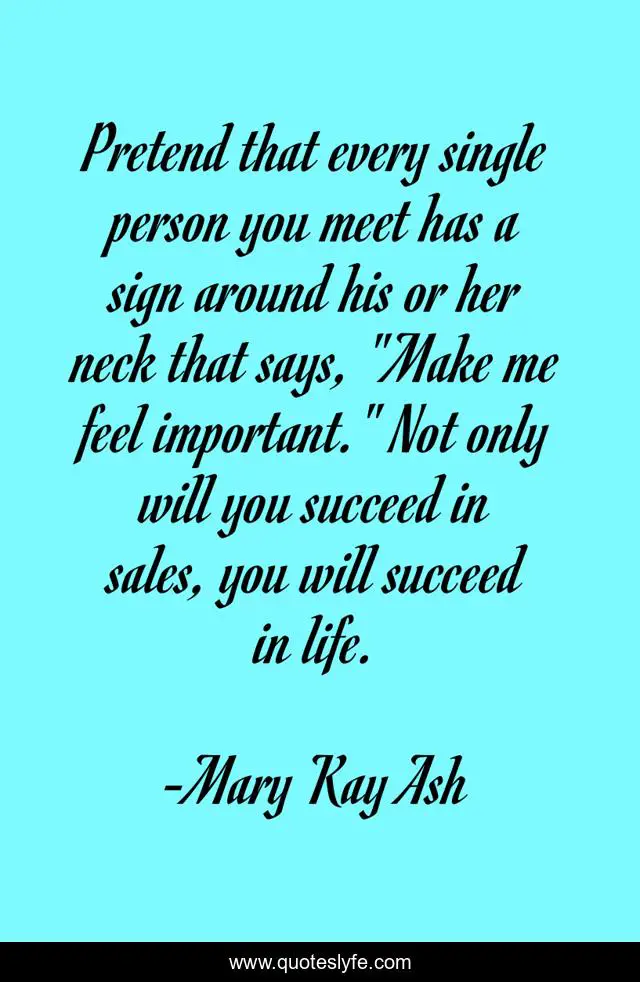 This page presents the quote "Pretend that every single person you meet has a sign around his or her neck that says, "Make me feel important." Not only will you succeed in sales, you will succeed in life.". Author of this quote is Mary Kay Ash. This quote is about life, success,.