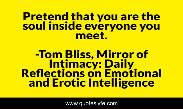 This page presents the quote "Pretend that you are the soul inside everyone you meet.". Author of this quote is Tom Bliss, Mirror of Intimacy: Daily Reflections on Emotional and Erotic Intelligence. This quote is about empathy, compassion, universal, soul, mirror, identity,.