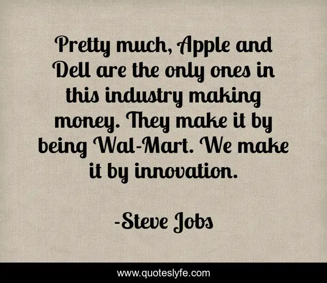 This page presents the quote "Pretty much, Apple and Dell are the only ones in this industry making money. They make it by being Wal-Mart. We make it by innovation.". Author of this quote is Steve Jobs. This quote is about apple, innovation,.