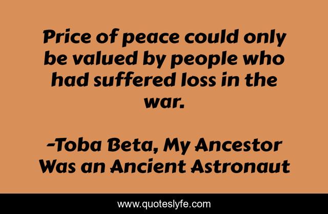 This page presents the quote "Price of peace could only be valued by people who had suffered loss in the war.". Author of this quote is Toba Beta, My Ancestor Was an Ancient Astronaut. This quote is about loss, life, people, price, peace, value, truth, suffer, war,.