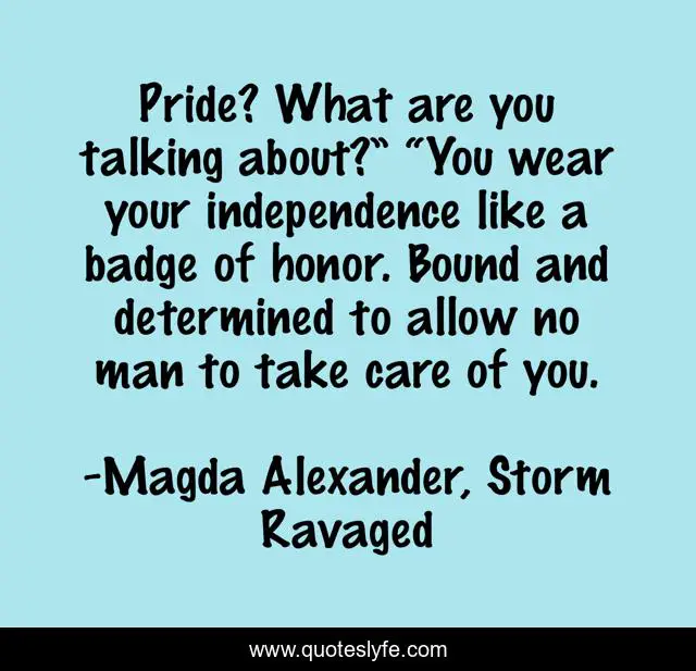 This page presents the quote "Pride? What are you talking about?” “You wear your independence like a badge of honor. Bound and determined to allow no man to take care of you.". Author of this quote is Magda Alexander, Storm Ravaged. This quote is about romance, erotic-romance, romantic-suspense,.