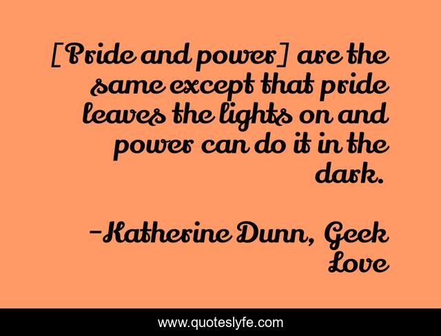 This page presents the quote "[Pride and power] are the same except that pride leaves the lights on and power can do it in the dark.". Author of this quote is Katherine Dunn, Geek Love. This quote is about pride, power,.