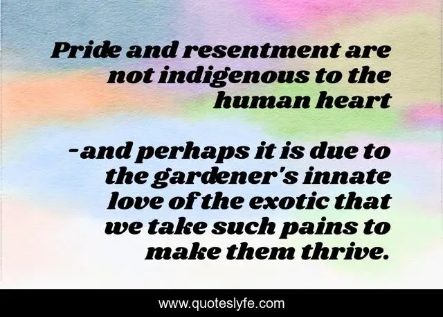 "and perhaps it is due to the gardener's innate love of the exotic that we take such pains to make them thrive. Quotes." Quoteslyfe.com, 2025. Fri. 05 Dec. 2025. <https://www.quoteslyfe.com/quote/Pride-and-resentment-are-not-indigenous-to-186268>.