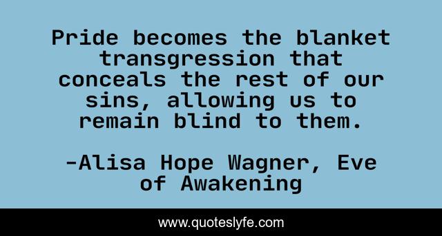 This page presents the quote "Pride becomes the blanket transgression that conceals the rest of our sins, allowing us to remain blind to them.". Author of this quote is Alisa Hope Wagner, Eve of Awakening. This quote is about faith, christianity, pride, sin, god,.