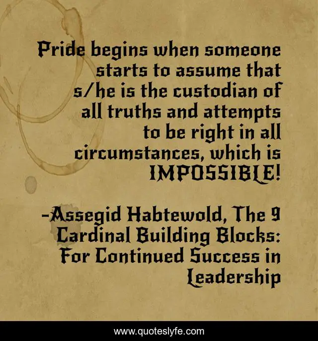 This page presents the quote "Pride begins when someone starts to assume that s/he is the custodian of all truths and attempts to be right in all circumstances, which is IMPOSSIBLE!". Author of this quote is Assegid Habtewold, The 9 Cardinal Building Blocks: For Continued Success in Leadership. This quote is about custodian, pride, right, impossible,.