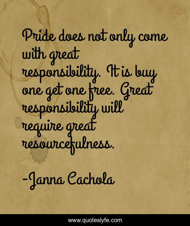 This page presents the quote "Pride does not only come with great responsibility. It is buy one get one free. Great responsibility will require great resourcefulness.". Author of this quote is Janna Cachola. This quote is about team-builder, resourcefulness, leadership, responsibility, pride, goal-digger,.