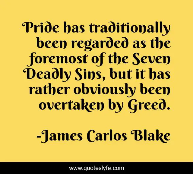 This page presents the quote "Pride has traditionally been regarded as the foremost of the Seven Deadly Sins, but it has rather obviously been overtaken by Greed.". Author of this quote is James Carlos Blake. This quote is about pride, sins, greed,.