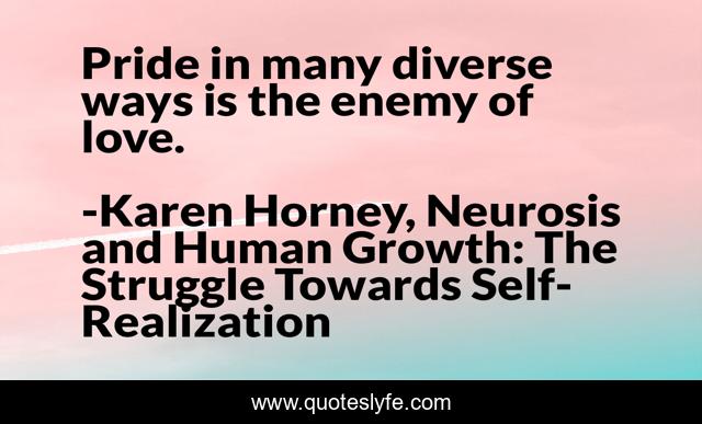 This page presents the quote "Pride in many diverse ways is the enemy of love.". Author of this quote is Karen Horney, Neurosis and Human Growth: The Struggle Towards Self-Realization. This quote is about pride, love, affection,.