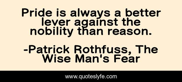 This page presents the quote "Pride is always a better lever against the nobility than reason.". Author of this quote is Patrick Rothfuss, The Wise Man's Fear. This quote is about arguing, reason, pride,.