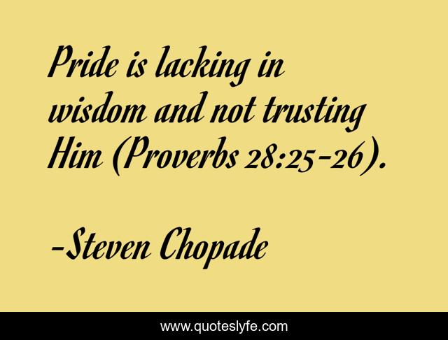 This page presents the quote "Pride is lacking in wisdom and not trusting Him (Proverbs 28:25-26).". Author of this quote is Steven Chopade. .
