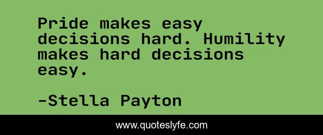This page presents the quote "Pride makes easy decisions hard. Humility makes hard decisions easy.". Author of this quote is Stella Payton. This quote is about arrogance, pride, decisions, decision-making, humility,.