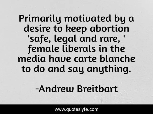This page presents the quote "Primarily motivated by a desire to keep abortion 'safe, legal and rare, ' female liberals in the media have carte blanche to do and say anything.". Author of this quote is Andrew Breitbart. This quote is about desire, media, abortion,.