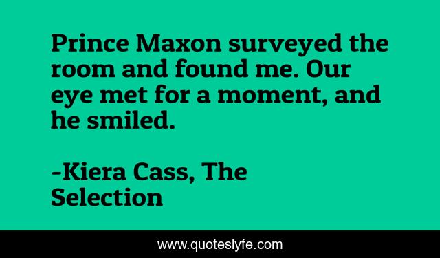 This page presents the quote "Prince Maxon surveyed the room and found me. Our eye met for a moment, and he smiled.". Author of this quote is Kiera Cass, The Selection. This quote is about kiera-cass, the-selection-trilogy, america-singer, romance-novels, dystopian-fiction, maxon-schreave,.