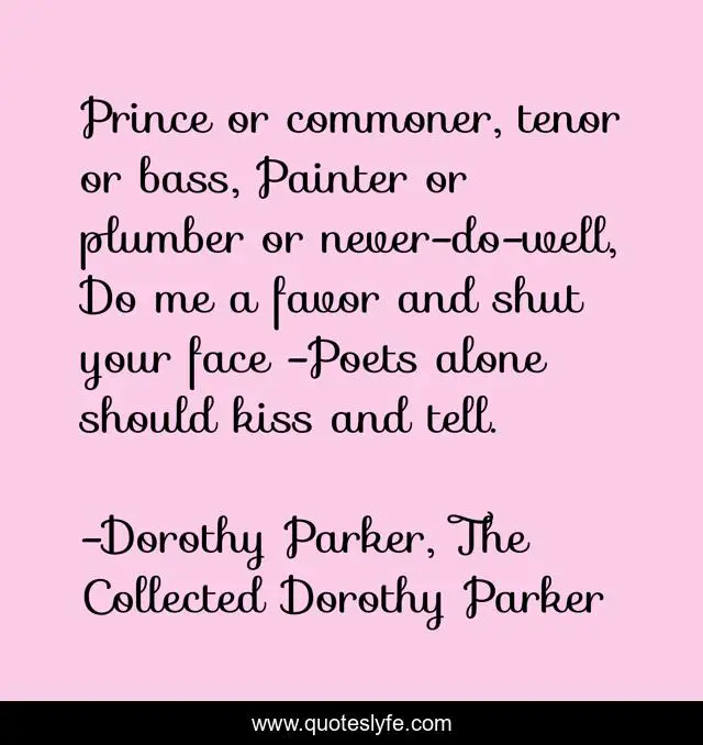 This page presents the quote "Prince or commoner, tenor or bass, Painter or plumber or never-do-well, Do me a favor and shut your face -Poets alone should kiss and tell.". Author of this quote is Dorothy Parker, The Collected Dorothy Parker. This quote is about relationships, gossip, men, love, affection,.
