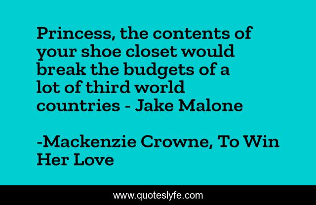 This page presents the quote "Princess, the contents of your shoe closet would break the budgets of a lot of third world countries - Jake Malone". Author of this quote is Mackenzie Crowne, To Win Her Love. This quote is about romance, romance-novels, humor, sports-romance,.