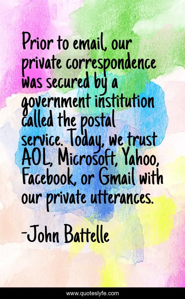"John Battelle Quotes." Quoteslyfe.com, 2025. Sat. 06 Dec. 2025. <https://www.quoteslyfe.com/quote/Prior-to-email-our-private-correspondence-was-315361>.