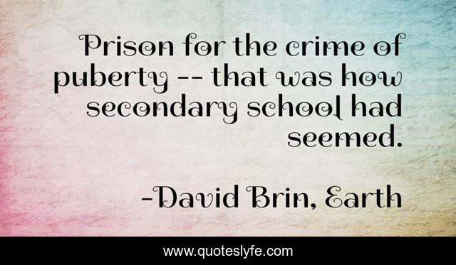 This page presents the quote "Prison for the crime of puberty -- that was how secondary school had seemed.". Author of this quote is David Brin, Earth. This quote is about school, education, teenage, puberty,.