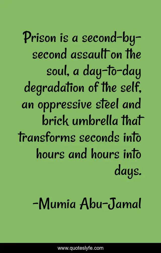 This page presents the quote "Prison is a second-by-second assault on the soul, a day-to-day degradation of the self, an oppressive steel and brick umbrella that transforms seconds into hours and hours into days.". Author of this quote is Mumia Abu-Jamal. This quote is about oppression, cages, prison,.