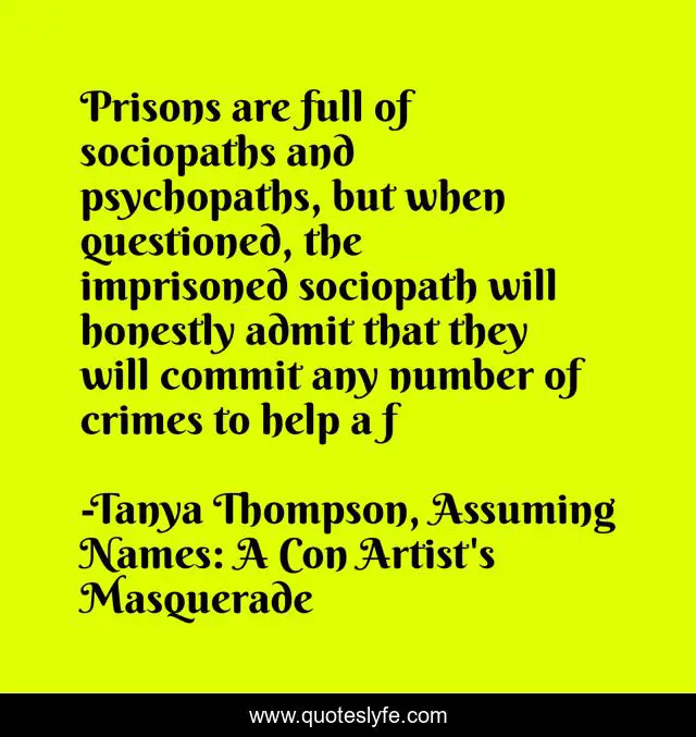 "Tanya Thompson, Assuming Names: A Con Artist's Masquerade Quotes." Quoteslyfe.com, 2025. Sun. 07 Dec. 2025. <https://www.quoteslyfe.com/quote/Prisons-are-full-of-sociopaths-and-psychopaths-126852>.