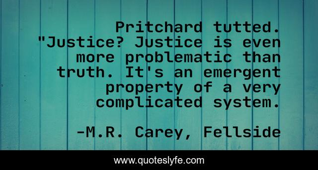This page presents the quote "Pritchard tutted. "Justice? Justice is even more problematic than truth. It's an emergent property of a very complicated system.". Author of this quote is M.R. Carey, Fellside. This quote is about justice, truth,.