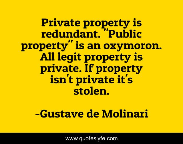 This page presents the quote "Private property is redundant. "Public property" is an oxymoron. All legit property is private. If property isn't private it's stolen.". Author of this quote is Gustave de Molinari. This quote is about government, freedom, laissez-faire, statism, liberty, libertarian, voluntaryism,.