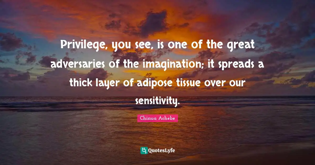 This page presents the quote "Privilege, you see, is one of the great adversaries of the imagination; it spreads a thick layer of adipose tissue over our sensitivity.". Author of this quote is Chinua Achebe. This quote is about thick, imagination, layers, sensitivity, privilege, adversaries, tissues,.