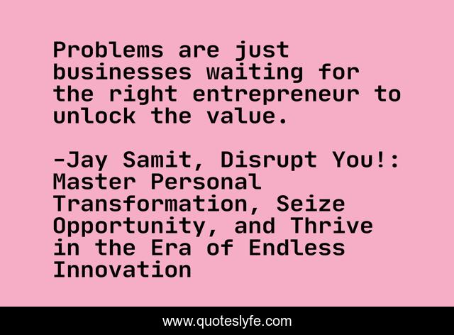 "Jay Samit, Disrupt You!: Master Personal Transformation, Seize Opportunity, and Thrive in the Era of Endless Innovation Quotes." Quoteslyfe.com, 2025. Sat. 06 Dec. 2025. <https://www.quoteslyfe.com/quote/Problems-are-just-businesses-waiting-for-the-106516>.