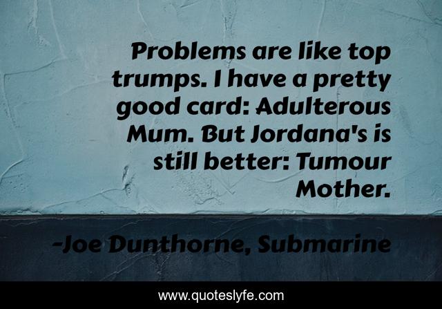 This page presents the quote "Problems are like top trumps. I have a pretty good card: Adulterous Mum. But Jordana's is still better: Tumour Mother.". Author of this quote is Joe Dunthorne, Submarine. .
