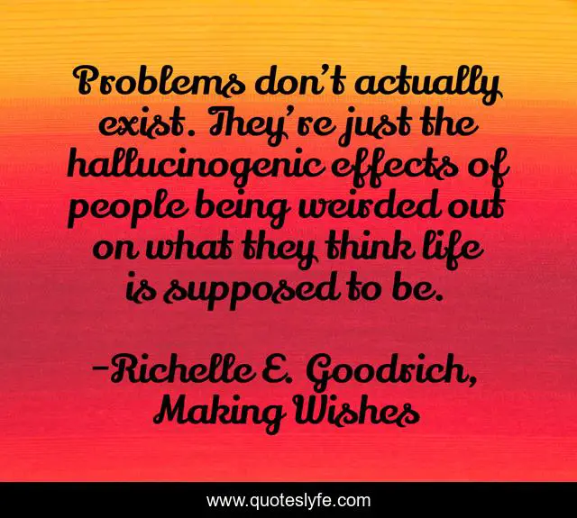 This page presents the quote "Problems don’t actually exist. They’re just the hallucinogenic effects of people being weirded out on what they think life is supposed to be.". Author of this quote is Richelle E. Goodrich, Making Wishes. This quote is about presumptions, life, weirded-out, richelle-e-goodrich, problems, expectations, assumptions, richelle, wishes,.