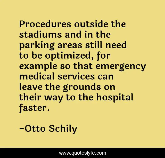 This page presents the quote "Procedures outside the stadiums and in the parking areas still need to be optimized, for example so that emergency medical services can leave the grounds on their way to the hospital faster.". Author of this quote is Otto Schily. This quote is about hospital, example, way,.