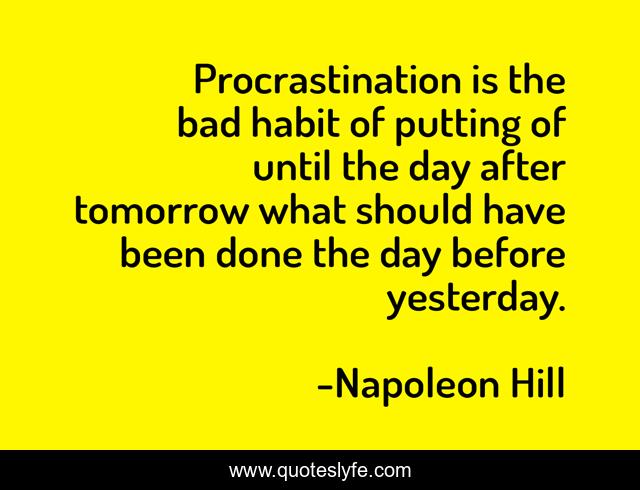 This page presents the quote "Procrastination is the bad habit of putting of until the day after tomorrow what should have been done the day before yesterday.". Author of this quote is Napoleon Hill. This quote is about positive, confidence, motivational, optimistic,.