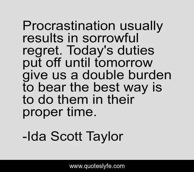 "Ida Scott Taylor Quotes." Quoteslyfe.com, 2025. Fri. 05 Dec. 2025. <https://www.quoteslyfe.com/quote/Procrastination-usually-results-in-sorrowful-regret-Today-278920>.