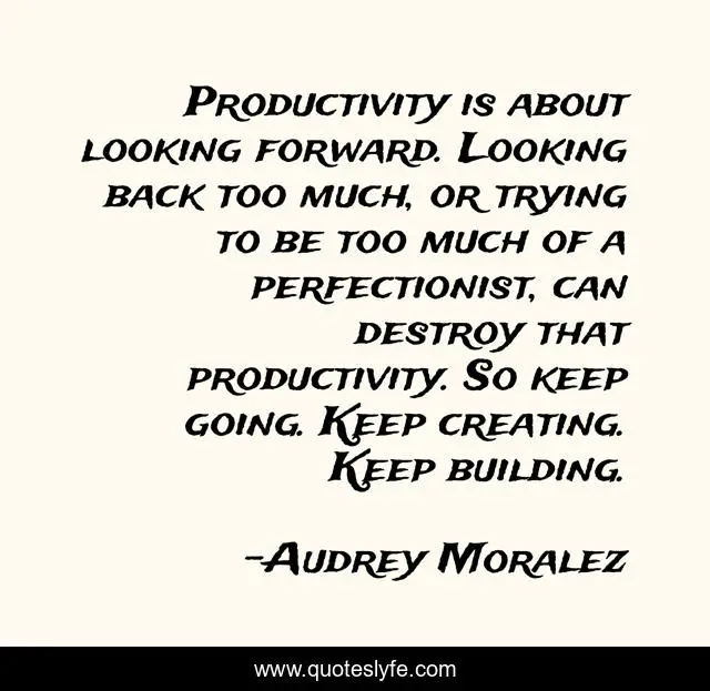This page presents the quote "Productivity is about looking forward. Looking back too much, or trying to be too much of a perfectionist, can destroy that productivity. So keep going. Keep creating. Keep building.". Author of this quote is Audrey Moralez. This quote is about action, creativity, productivity, perfectionism, writing,.