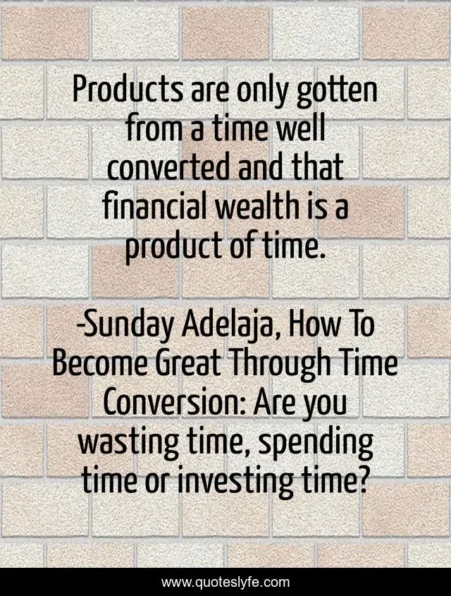 This page presents the quote "Products are only gotten from a time well converted and that financial wealth is a product of time.". Author of this quote is Sunday Adelaja, How To Become Great Through Time Conversion: Are you wasting time, spending time or investing time?. This quote is about products-of-time, life, conversion, productivity, wealth, greatness, waste, humanity, product,.