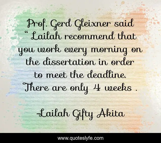 This page presents the quote "Prof. Gerd Gleixner said “ Lailah recommend that you work every morning on the dissertation in order to meet the deadline. There are only 4 weeks .". Author of this quote is Lailah Gifty Akita. This quote is about dissertation, work, deadlines, morning, phd-thesis, writing,.