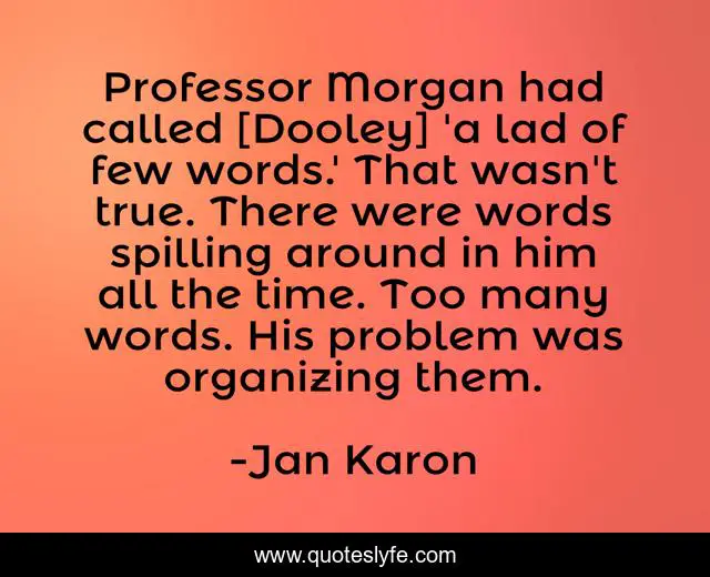 This page presents the quote "Professor Morgan had called [Dooley] 'a lad of few words.' That wasn't true. There were words spilling around in him all the time. Too many words. His problem was organizing them.". Author of this quote is Jan Karon. This quote is about jan-karon, dooley, words,.