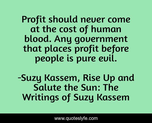 This page presents the quote "Profit should never come at the cost of human blood. Any government that places profit before people is pure evil.". Author of this quote is Suzy Kassem, Rise Up and Salute the Sun: The Writings of Suzy Kassem. This quote is about people, corruption-blood, imperialism, human, corrupt, crooked, colonialism, human-life, political,.