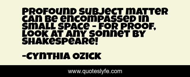 This page presents the quote "Profound subject matter can be encompassed in small space - for proof, look at any sonnet by Shakespeare!". Author of this quote is Cynthia Ozick. This quote is about small, look, profound,.