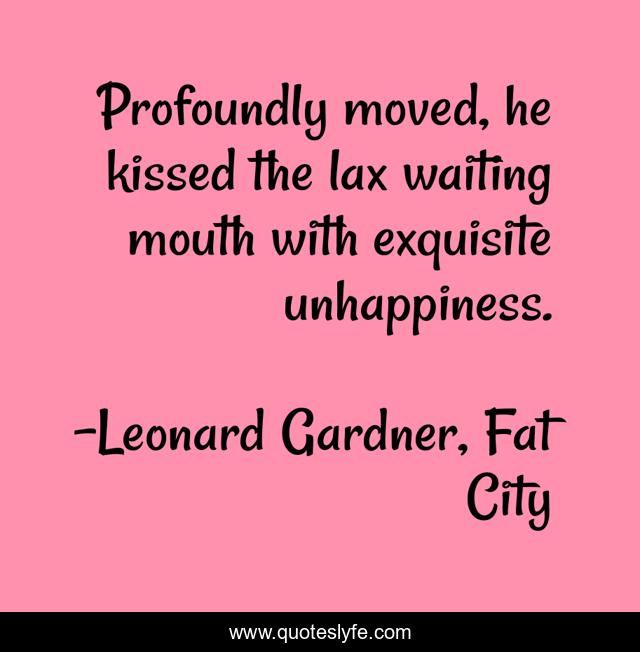 This page presents the quote "Profoundly moved, he kissed the lax waiting mouth with exquisite unhappiness.". Author of this quote is Leonard Gardner, Fat City. This quote is about mouth, kiss, unhappiness,.