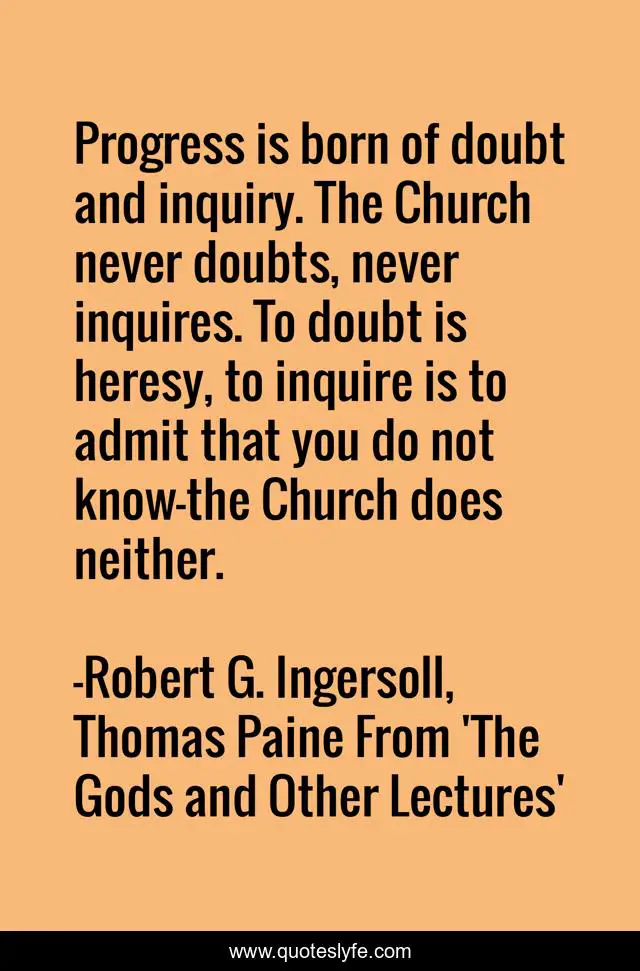 This page presents the quote "Progress is born of doubt and inquiry. The Church never doubts, never inquires. To doubt is heresy, to inquire is to admit that you do not know—the Church does neither.". Author of this quote is Robert G. Ingersoll, Thomas Paine From 'The Gods and Other Lectures'. This quote is about heresy, science, skepticism, doubt, inquiry,.