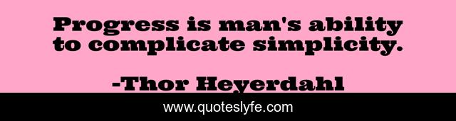 This page presents the quote "Progress is man's ability to complicate simplicity.". Author of this quote is Thor Heyerdahl. This quote is about progress, man, simplicity,.