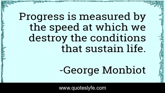 This page presents the quote "Progress is measured by the speed at which we destroy the conditions that sustain life.". Author of this quote is George Monbiot. This quote is about environment, progress, climate, ecology,.