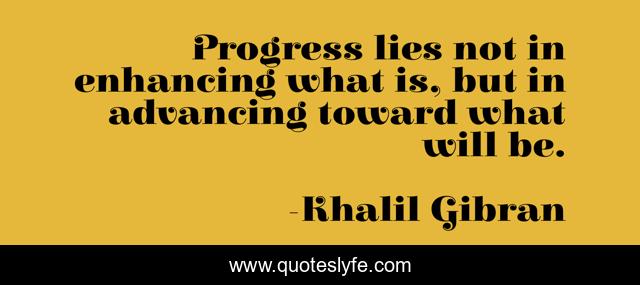 This page presents the quote "Progress lies not in enhancing what is, but in advancing toward what will be.". Author of this quote is Khalil Gibran. This quote is about progress, toward,.